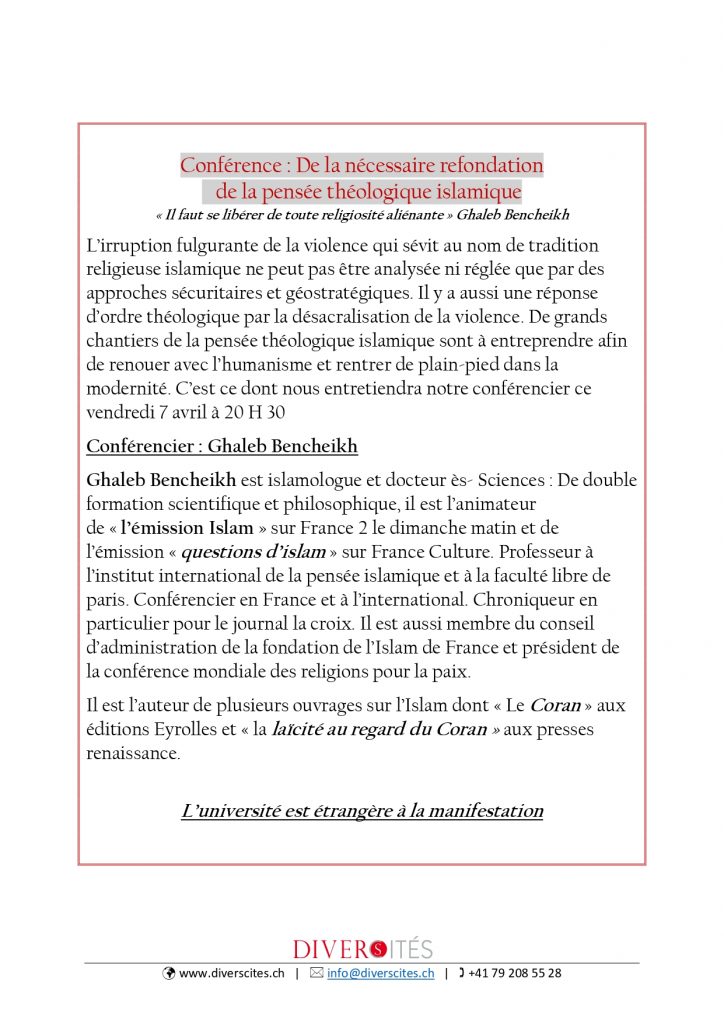 Conférences De la nécessaire refondation de la pensée théologique islamique Conférencier : Ghaleb Bencheikh Diverses actualités CHEVALI – DOCUMENTAIRES FESTIVAL ITINERANT du CHEVAL 6 mars 2023 CHEVALI – DOCUMENTAIRES FESTIVAL ITINERANT du CHEVAL 6 mars 2023 CHEVALI – DOCUMENTAIRES FESTIVAL ITINERANT du CHEVAL 6 mars 2023 CHEVALI – DOCUMENTAIRES : FESTIVAL ITINERANT du CHEVAL 6 mars 2023